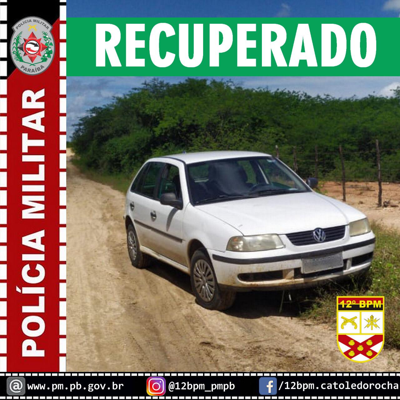 Nesta terça-feira (19 de maio) policiais militares da 2ª Companhia do 12º BPM apreenderam um veículo Volkswagem Gol de cor branca e de placas MUS 9822 que havia sido roubado de um taxista na noite do último domingo entre as cidades de Brejo do Cruz-PB e Jardim de Piranhas-RN.