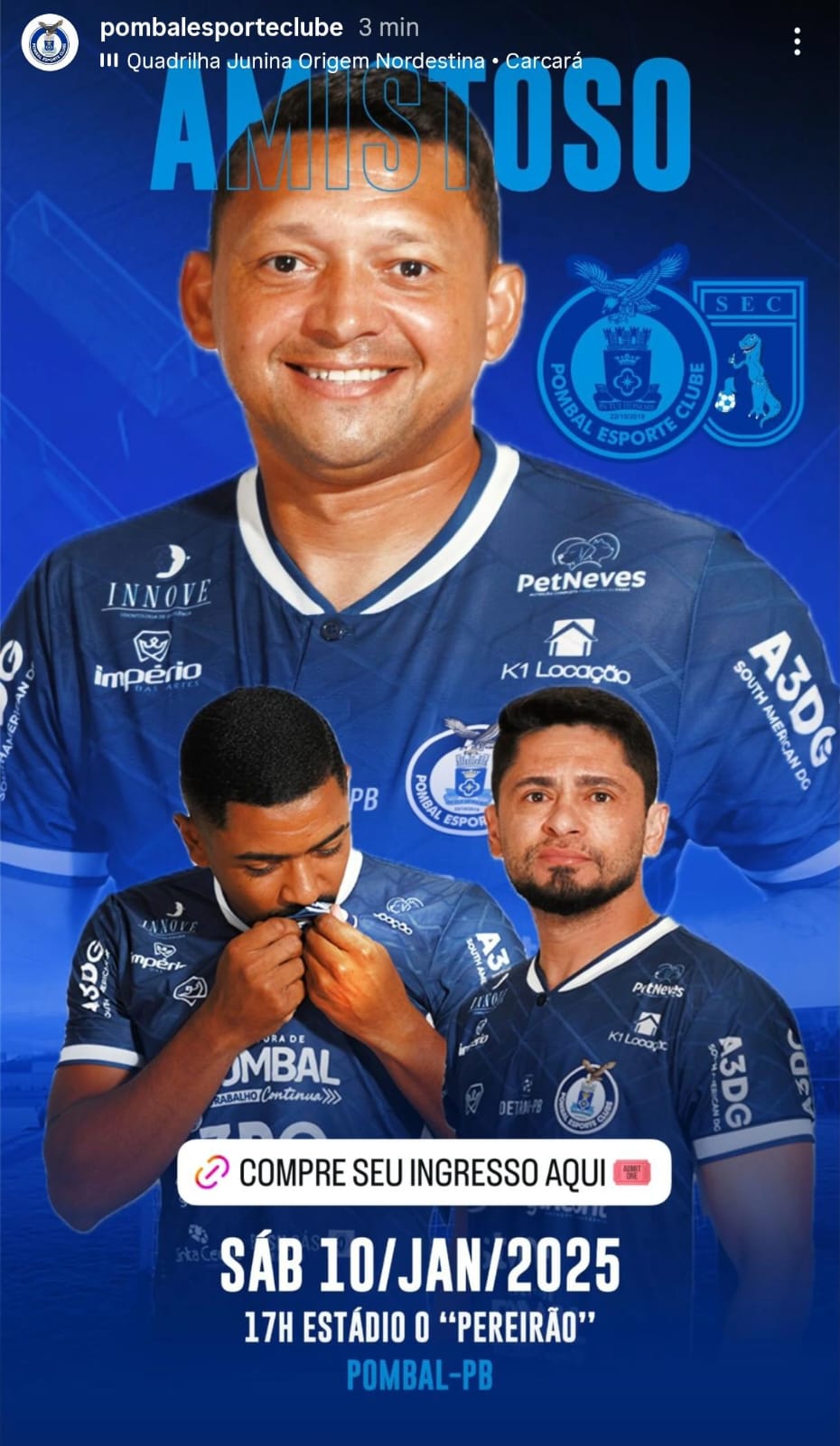 O jogo será realizado no Estádio Municipal O Pereirão, palco de grandes histórias do futebol pombalense. A presença da torcida faz toda a diferença vamos ajudar o Carcará! Você é nosso convidado para viver essa emoção no estádio.