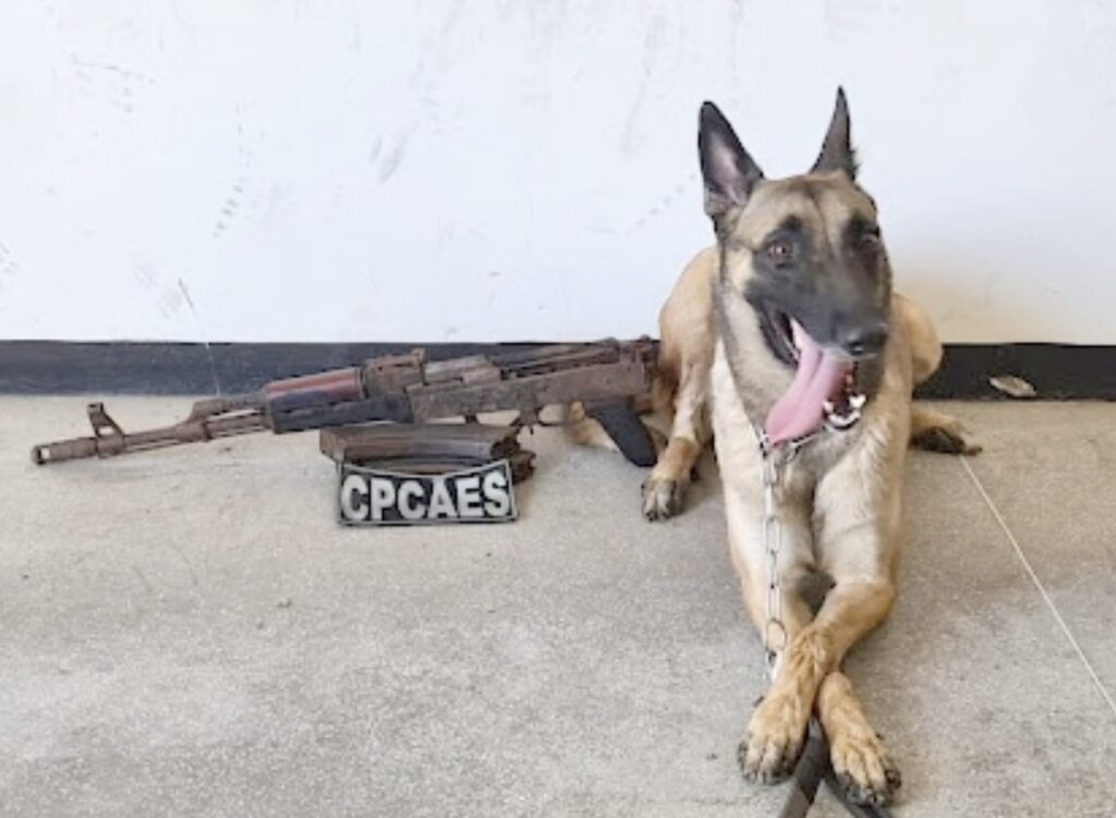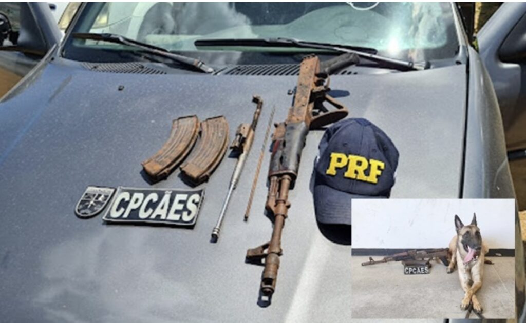 De posse das informações foram acionados os agentes da PRF (F.Augusto e Reclyone) para acompanhar a busca. Ao chegar ao local, utilizando da cadela de trabalho de faro, Sasha, sinalizou algo no interior do veículo. Ao ser realizada uma busca veicular no local indicado pela cadela, o Cb Eduardo localizou por debaixo do banco traseiro um FUZIL AK47 com dois (02) carregadores sem munições.