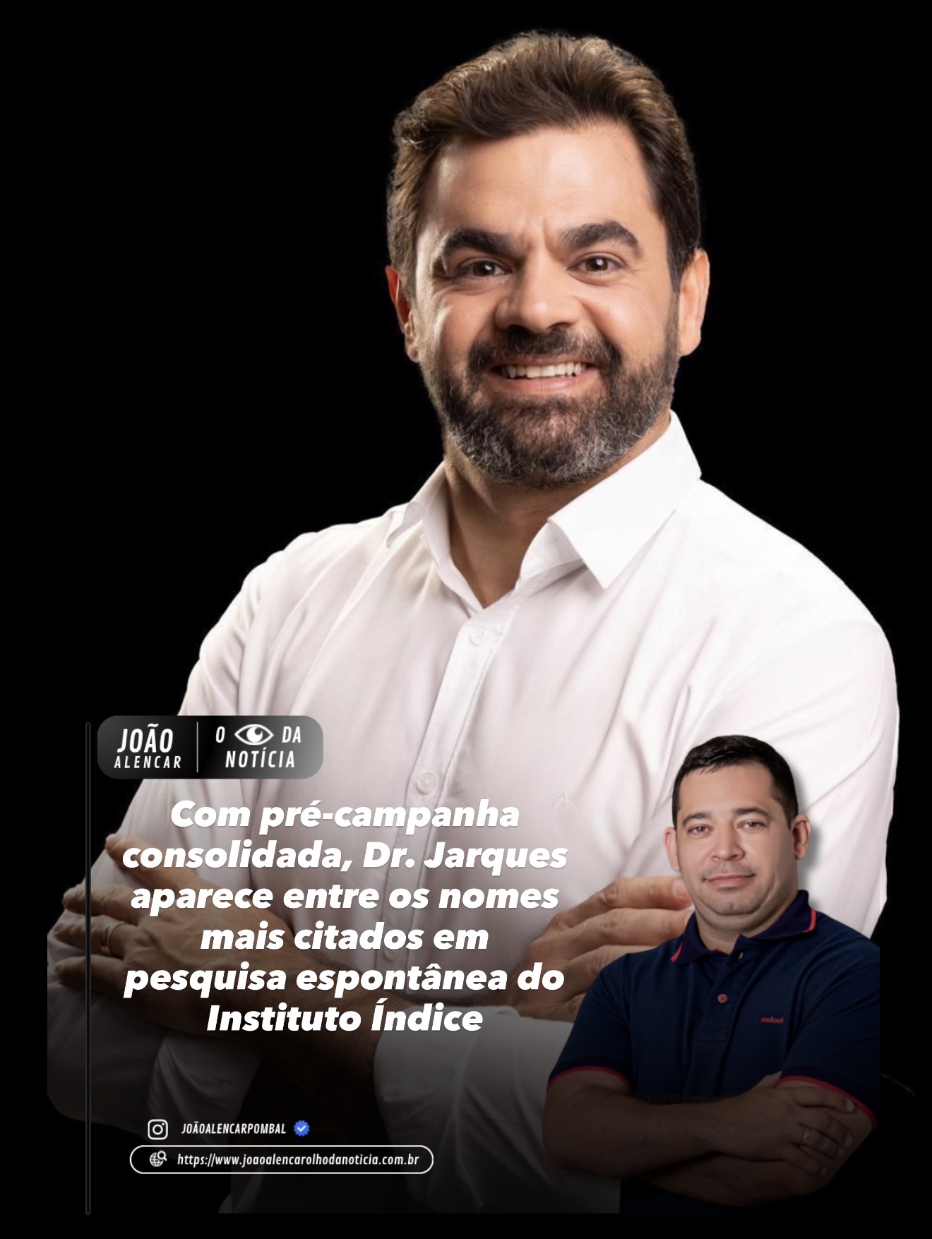 Dr. Jarques aparece na 9ª colocação com 0,75%. Já os deputados Adriano Galdino (Republicanos), Eduardo Carneiro (Solidariedade) e Walber Virgulino (PL) aparecem nas primeiras posições das intenções de voto na pesquisa.