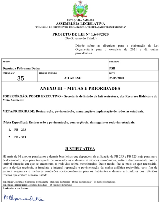 Confira um dos requerimentos de Pollyanna Dutra e sua Emenda voltada à recuperação da PB 323: fonte assessoria