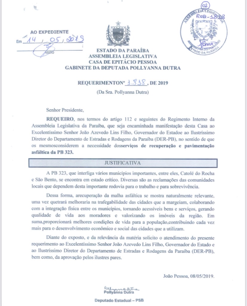 Confira um dos requerimentos de Pollyanna Dutra e sua Emenda voltada à recuperação da PB 323: fonte assessoria