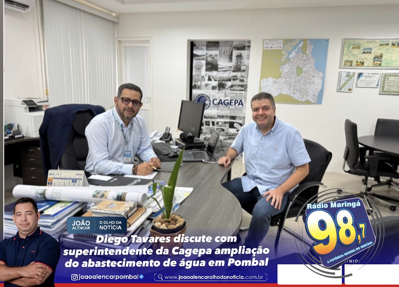 O suplente de senador e pré-candidato a deputado estadual, Diego Tavares (PP), participou de uma audiência com o superintendente da Companhia de Água e Esgotos da Paraíba (Cagepa), Marcos Vinícius, para tratar da ampliação do sistema de abastecimento de água do município de Pombal, no sertão paraibano. O pleito foi encaminhado, após Tavares cumprir, no último final de semana, agenda de visitas em Pombal, na companhia da pré-candidata a deputada federal, Pollyana Werton (PP) e do ex-candidato a prefeito, Pedro Feitosa.