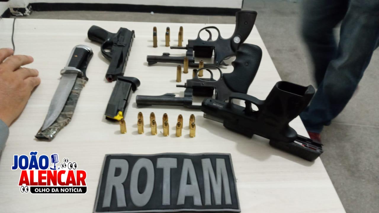 Acionada a PM/Rotam, logo após o fato, conseguiu apreender os dois, apreendendo ainda dois revólveres, um simulacro e a pistola roubada da vítima.
