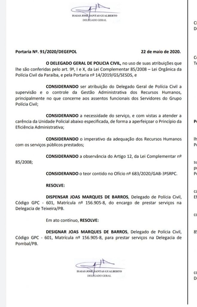 O Delegado Clenaldo Queiroz de Medeiros, o qual era responsável pela 1@ Delegacia, será removido para a cidade de Teixeira. Para ocupar seu lugar, está vindo o Delegado Joás Marques de Barros.fonte João Alencar
