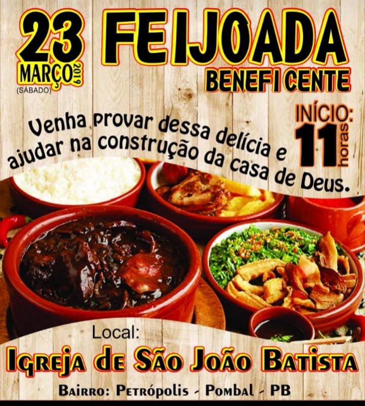 NESTE PRÓXIMO SÁBADO, DIA 23, POR VOLTA DAS 11H, SERÁ REALIZADA UMA FEIJOADA BENEFICENTE EM PROL DA CONSTRUÇÃO DA IGREJA SÃO JOÃO BATISTA, SITUADA NO BAIRRO PETRÓPOLIS EM POMBAL.