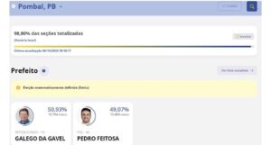 Em Pombal, o candidato Galego da Gavel (Republicanos) foi eleito e é vitorioso com 50,93% dos votos válidos, totalizando 10.794 votos. Gavel derrotou Pedro Feitosa, filho da deputada Pollyanna Dutra, que tirou 10.400 votos, o que corresponde a 49,07%. Fonte O Blog do Jordan Bezerra