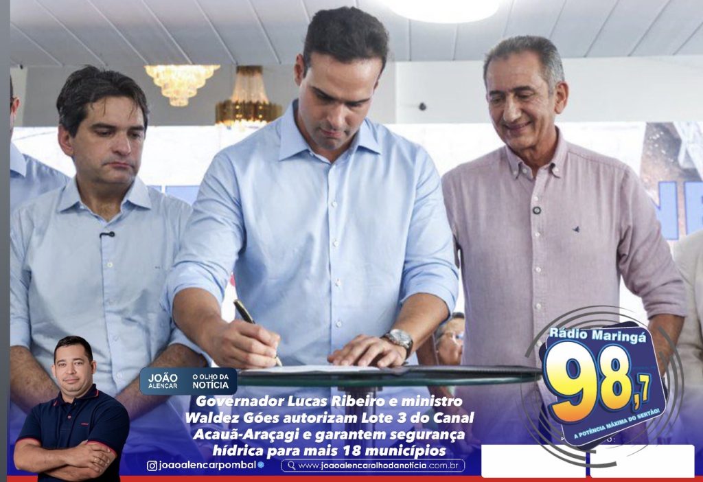O governador Lucas Ribeiro e o ministro da Integração e do Desenvolvimento Regional (MIDR), Waldez Góes, assinaram, na tarde desta quarta-feira (15), em solenidade realizada no município de Itapororoca, a Ordem de Serviço para a execução do Lote 3 do Canal das Vertentes Litorâneas/Acauã-Araçagi, que vai garantir segurança hídrica para mais de 200 mil pessoas que vivem em 18 municípios paraibanos. A parceria entre o Governo da Paraíba e o Governo Federal, nesta etapa do projeto, que já teve os lotes 1 e 2 entregues em 2024, terá investimentos superiores a R$ 200 milhões.