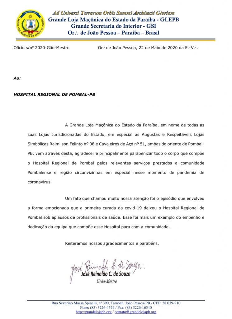 O Hospital Regional de Pombal (HRP) recebeu, na manhã deste sábado (23), o reconhecimento da Grande Loja Maçônica do Estado da Paraíba (GLEPB) pelo trabalho que vem sendo desenvolvido para o enfrentamento à covid-19. Por meio de ofício assinado pelo grão-mestre José Reinaldo de Souza, a GLEPB parabeniza e agradece a todos os profissionais que compõem a unidade hospitalar, também pelos relevantes serviços prestados à comunidade pombalense e região.