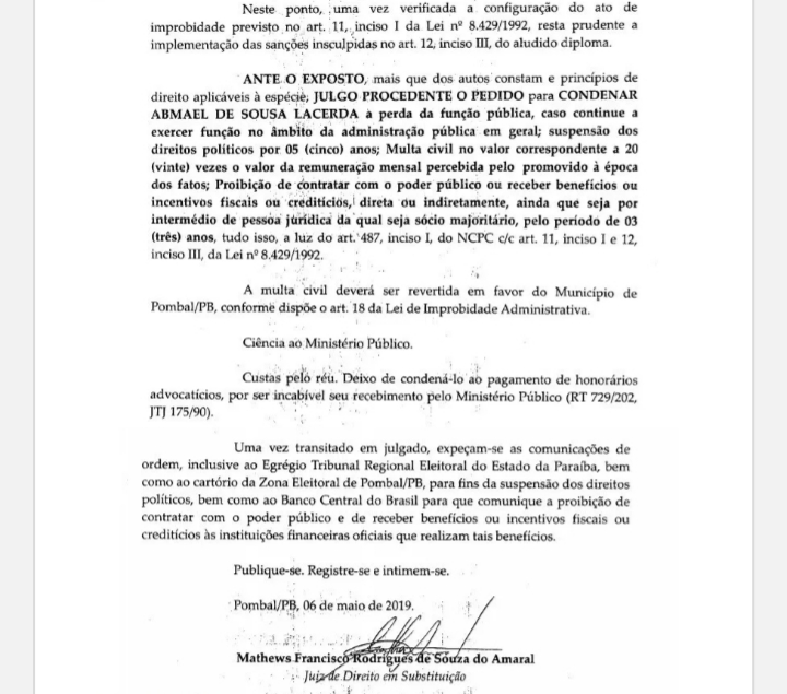 O juiz Mathews Francisco Rodrigues, da 1ª Vara da Comarca de Pombal, condenou o prefeito Abmael de Sousa Lacerda(Verissinho-MDB) por atos de improbidade administrativa, praticados ainda durante seu primeiro mandato, entre 1997 e 2000.