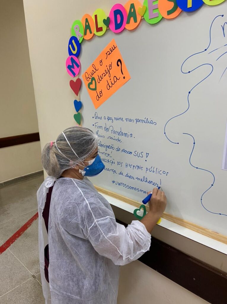 Conforme a nutricionista da Área Covid-19 da instituição, Fhiama Oliveira, “no mural os profissionais podem escrever sobre os seus sentimentos, receber recados de pacientes regressos do serviço e motivar uns aos outros. Acredito que isso compõe uma equipe que caminha junto e visa o bem-estar de todos. Isso é SUS!”, finaliza a Fhiama.