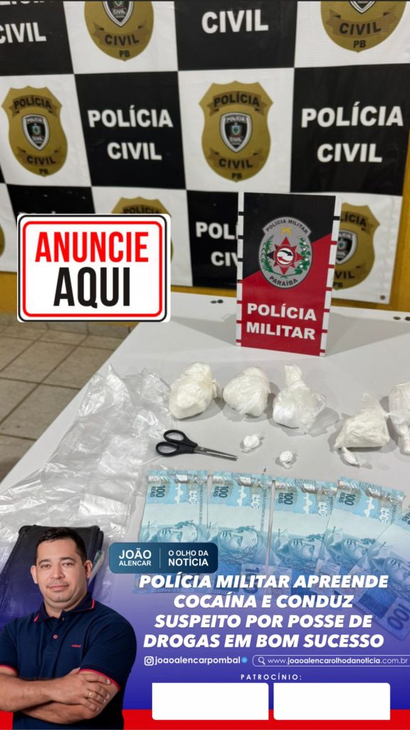 Policiais militares realizaram a apreensão de entorpecentes e conduziram um suspeito por posse de drogas na zona rural do município de Bom Sucesso, no Sertão da Paraíba.