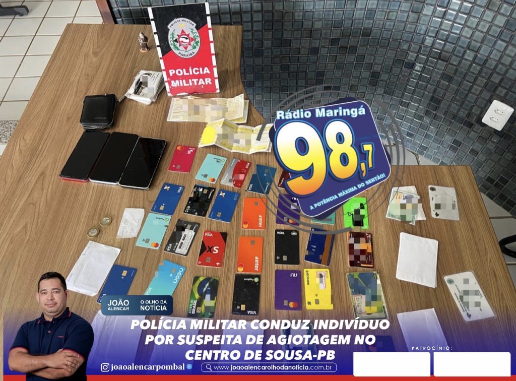 Diante dos fatos, o material apreendido — incluindo *3 aparelhos celulares, 10 promissórias, cerca de 25 cartões bancários, documentos pessoais de terceiros e uma carteira* — foi apresentado, juntamente com o conduzido, à Delegacia de Polícia Civil de Sousa para as providências cabíveis. O veículo também foi apreendido por apresentar irregularidades documentais.