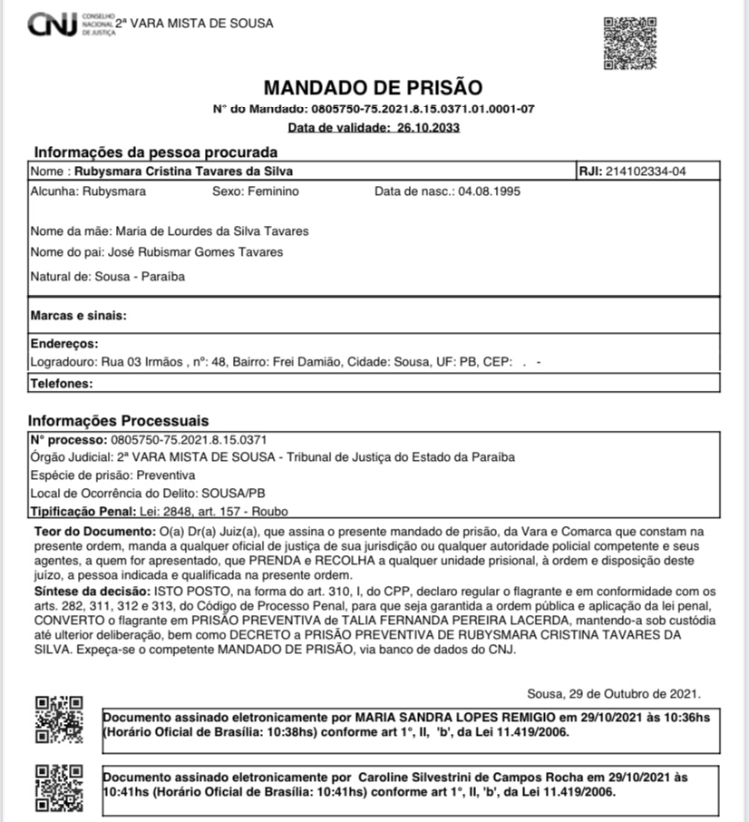 75.2021.8.15.0371.01.0001-07, expedido pela 2ª Vara Mista de Sousa em desfavor da jovem Rubysmara Cristina Tavares da Silva, vulgo “Mara”.