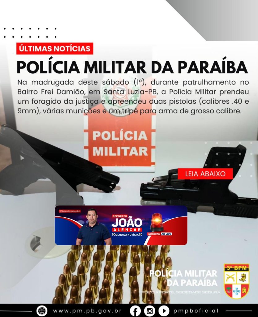 Na tarde desta sexta-feira, 31 de janeiro, por volta das 17h, as guarnições da 3ª Cia/3º BPM, realizavam patrulhamento no Bairro Frei Damião, em Santa Luzia-PB, que resultou na prisão de um foragido da justiça, além da apreensão de duas pistolas, calibres .40 e 9mm, várias munições e um tripé para arma de grosso calibre.