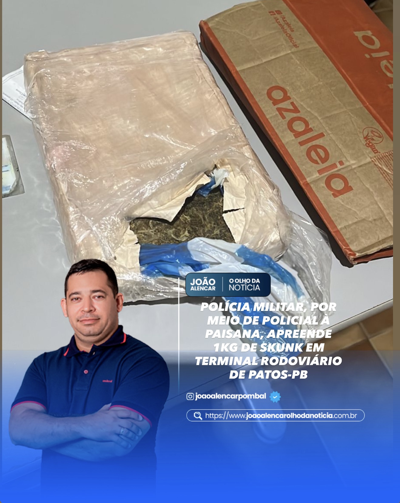 Patos-PB, 30 de setembro de 2025 – A Polícia Militar, por meio do policial de folga, realizou a apreensão de 1kg de substância entorpecente conhecida como skunk, também chamada de super maconha, no Terminal Rodoviário de Patos, no início da noite desta terça-feira (30). A droga estava sendo transportada por um homem de 21 anos, oriundo da capital João Pessoa.