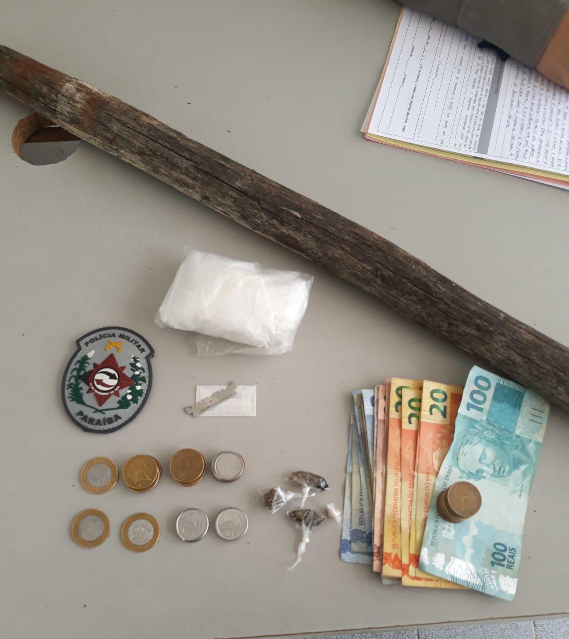 A cônjuge do suspeito acionou a Polícia Militar, após sofrer agressão física praticada por ele. Equipe no local, constatou a veracidade do teor da denúncia de violência doméstica, prendendo o autor dos fatos. Ainda receberam da vítima o informe de que em sua residência haveria entorpecentes que são comercializados por seu companheiro. Realizada a busca domiciliar, dentro do estado de flagrante delito, foi localizada a droga, dinheiro em espécie, um pedaço de madeira utilizado na agressão.