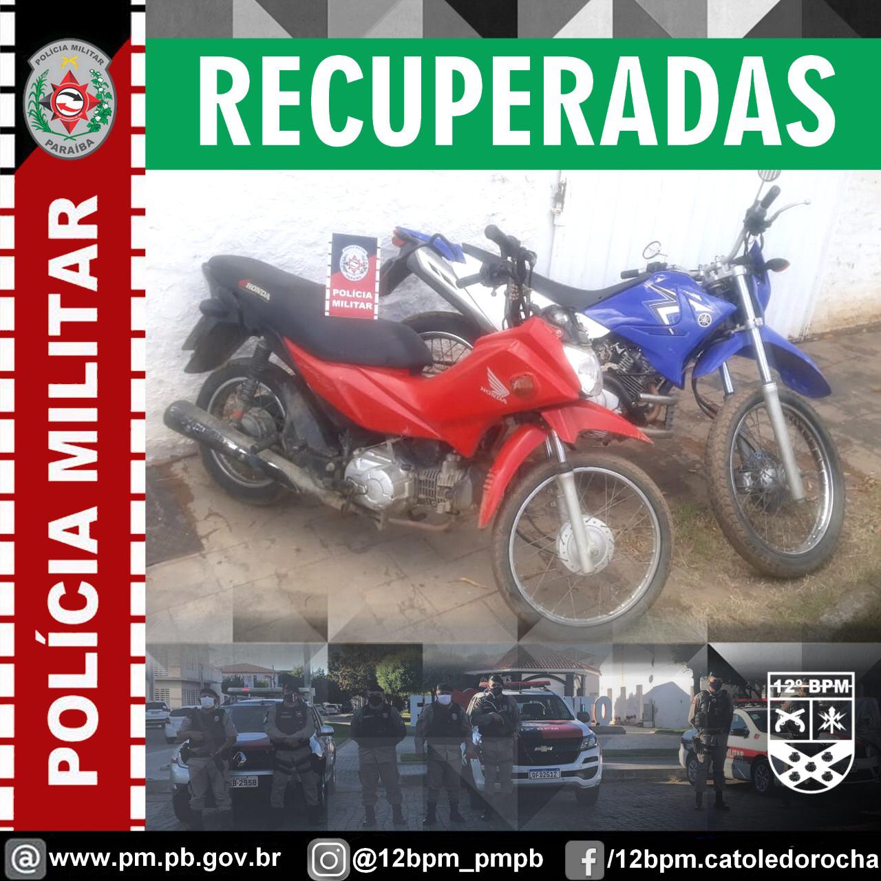 Nesta terça-feira (11 de agosto) policiais militares do 12° Batalhão recuperaram, na zona rural de São Bento, duas motocicletas: uma Honda Pop 100 de cor vermelha e uma XTZ 125 de cor azul, com queixa de roubo. Onde haviam sido roubadas na noite de ontem no centro da cidade.