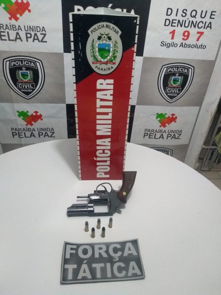 Próximo às margens da BR 230, o homem veio a cair ao solo e arremessou a arma de fogo sobre o muro de uma residência. Com a devida autorização da proprietária, os policiais adentraram a casa e conseguiram encontrar no terreno um *Revólver Calibre .38 com cinco munições intactas*.