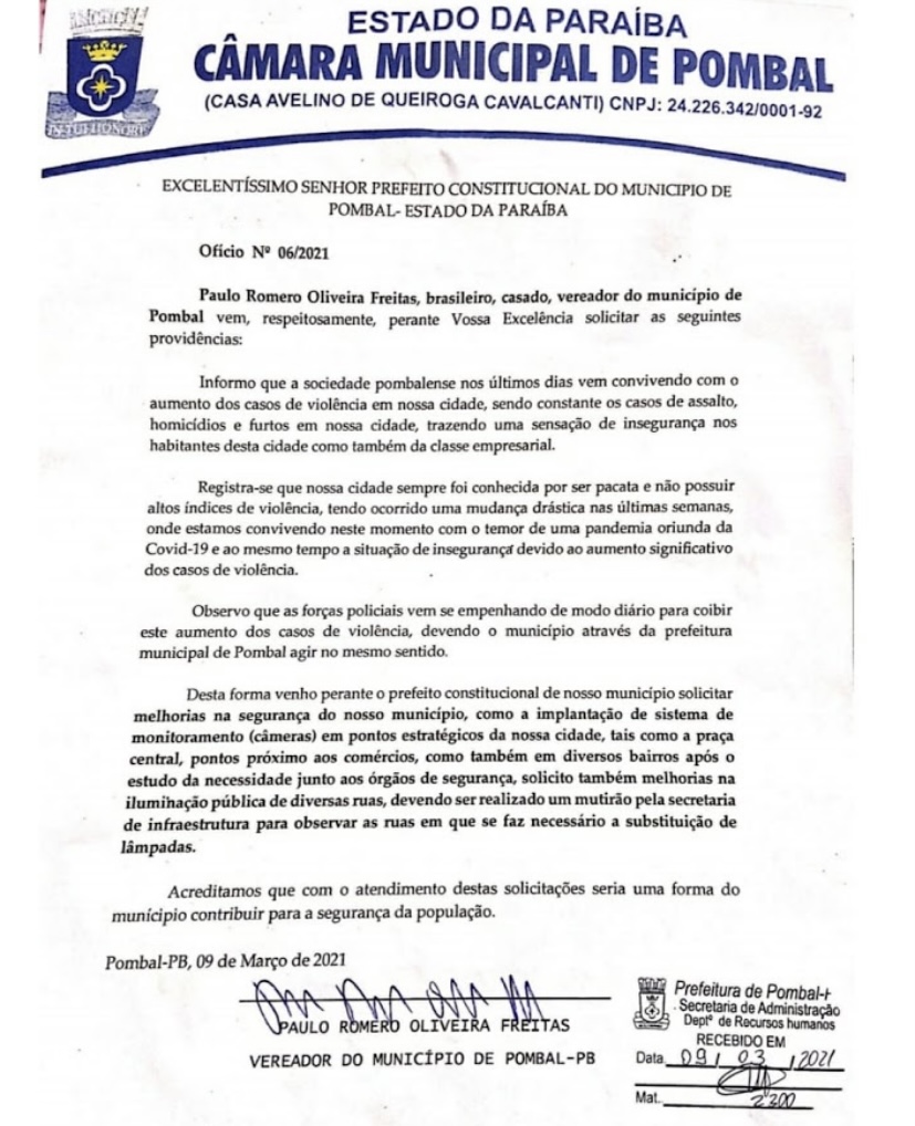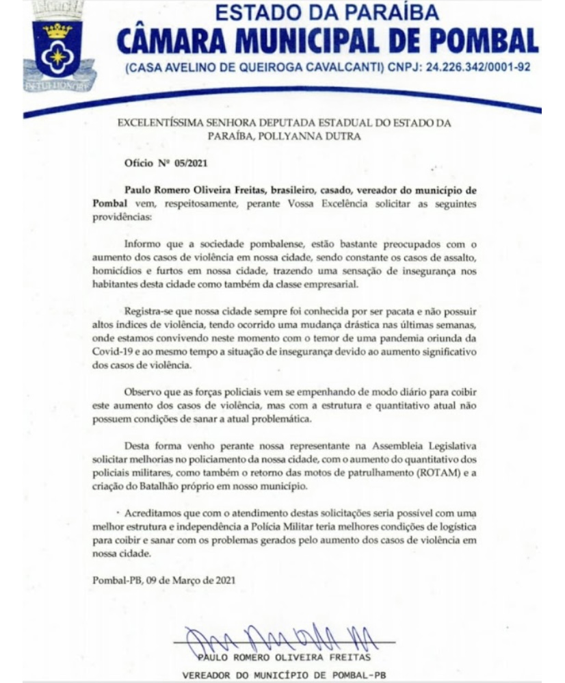 Foi Romero Freitas (PL) que enviou ofício para o comandante geral da polícia militar da Paraíba solicitando ações no município. Solicitou também a volta das motos da ROTAM para Pombal, uma vez que foram levadas em 2020.
