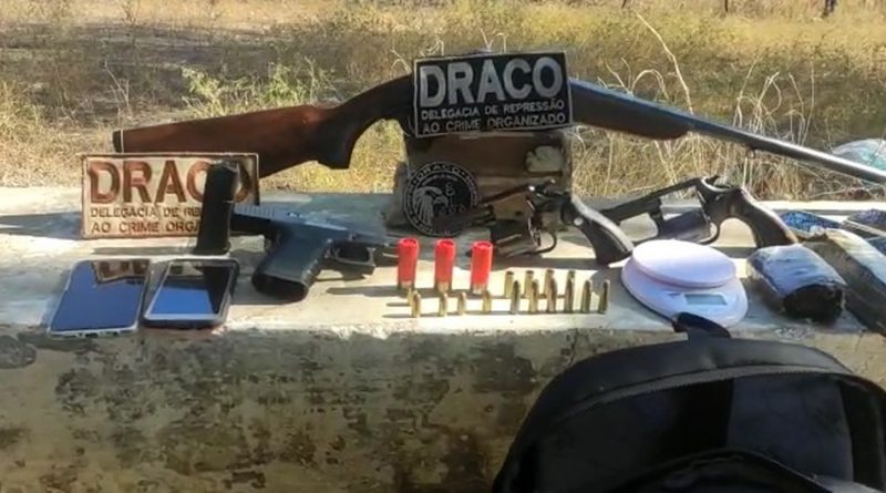 Na ação, os agentes da DRACO apreenderam 01espingarda calibre.12, 01 pistola calibre.380, dois revólveres calibres.38 e cerca de 04 kg de maconha. Fonte DRACO