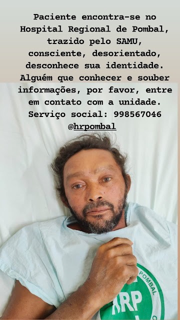 Se você conhece esse homem da foto, entre em contato com o serviço de assistência social do Hospital Regional de Pombal (HRP), ligando para o (83) 99856-7046.