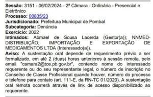 O TCE – PB (Tribunal de Contas do Estado da Paraíba) intimou o prefeito de Pombal para explicar irregularidades em pregão presencial para aquisição de medicamentos básicos. O órgão recebeu uma denúncia contra o gestor Abmael de Sousa Lacerda alegando que licitantes foram inabilitadas sem justificativa e que ocorreu a modificação da data de análise dos documentos de habilitação sem o devido aviso prévio. Segundo a denúncia, a ata da sessão pública do certame não tem assinatura dos representantes das empresas.