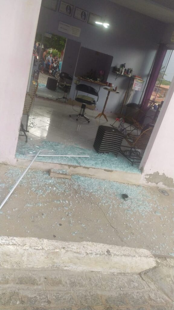 Um comercio vizinho teve a porta de vidro quebrada, foi atingida pelos disparos.